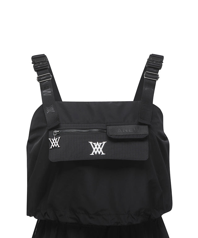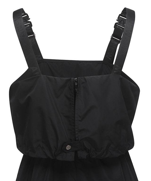 This is a suspender-style dress. Tape with shoulder analog was put in and through the buckle. Length can be adjusted. Put a thin rubber on the armpit to comfortably fit your chest circumference will increase. A fake pocket was put in the front chest to give Anew's hip point and the waist. It can be adjusted by tightening the string. The bottom part has a wide flare to give a cute point. Snaps at the end of the hem allow for adjustment during activity. It is detachable through the zipper in the back center. A D-ring is attached to the back of the waist for simple hanging.